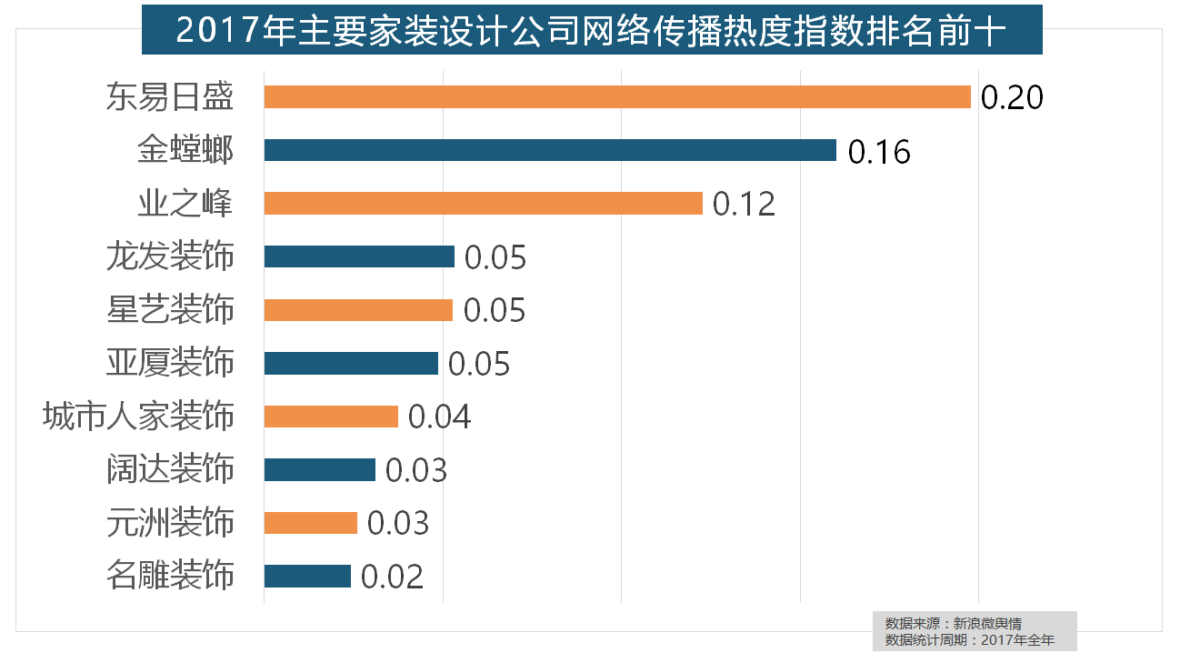 伴跟着我国度拆市场的繁荣,一批具有必然规模的家拆设想公司也纷纷出现。据新浪微舆情对2017年我国次要家拆设想公司大数据阐发显示,东易日盛正在过去的一年中收集热度指数最高,金螳螂、业之峰、龙发粉饰、星艺粉饰紧随其后。此外,名雕粉饰、亚厦粉饰、阔达粉饰、元洲粉饰也榜上出名,位列年度家拆设想公司热度排行榜六至十位。